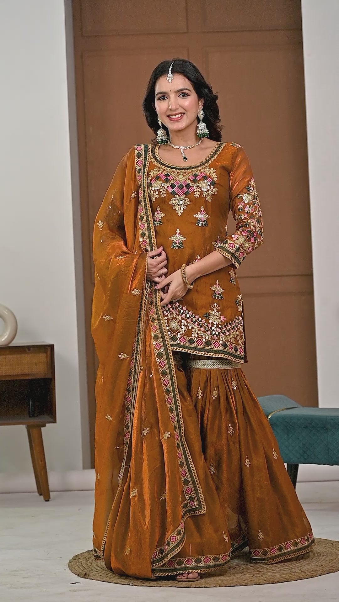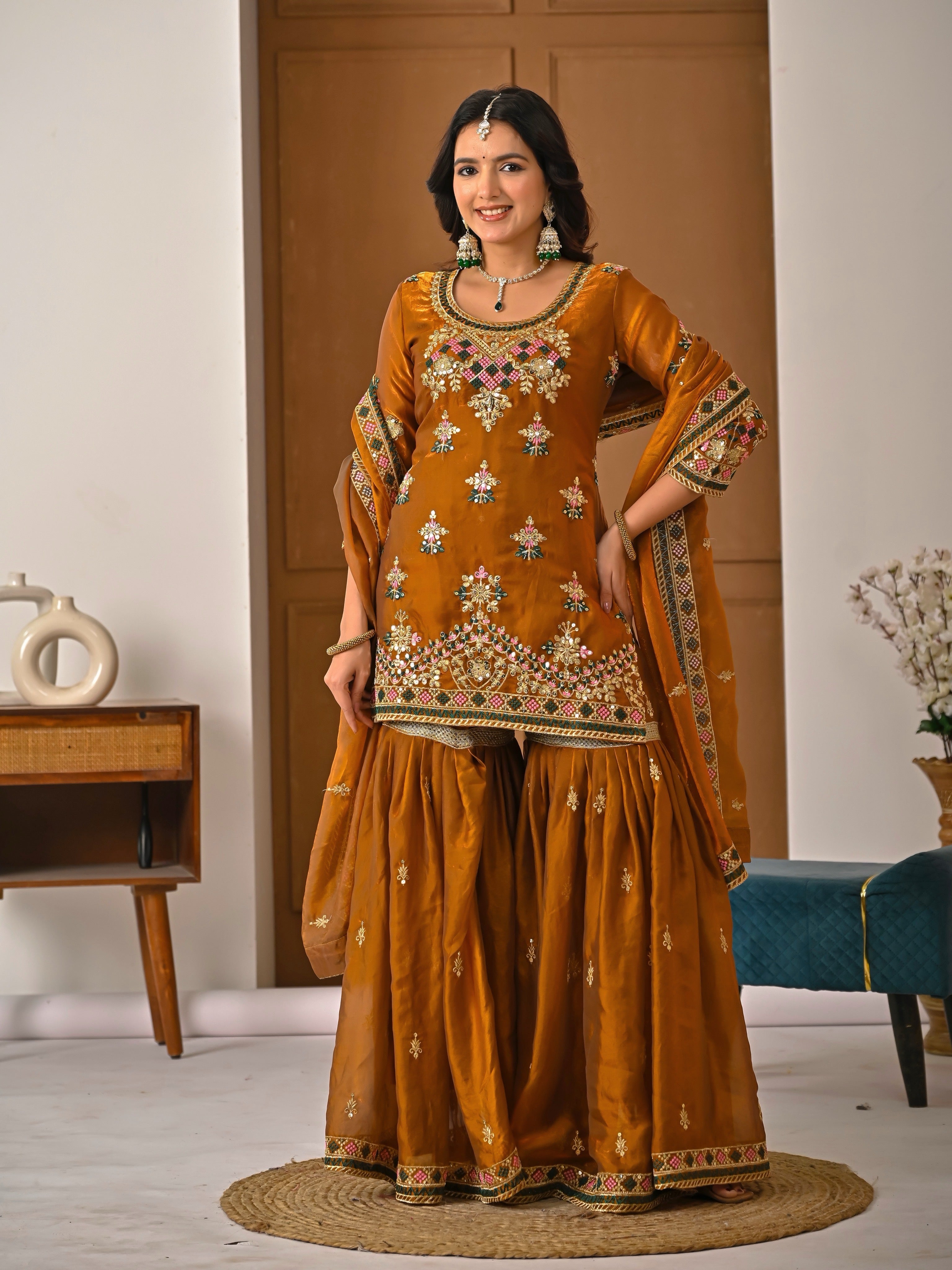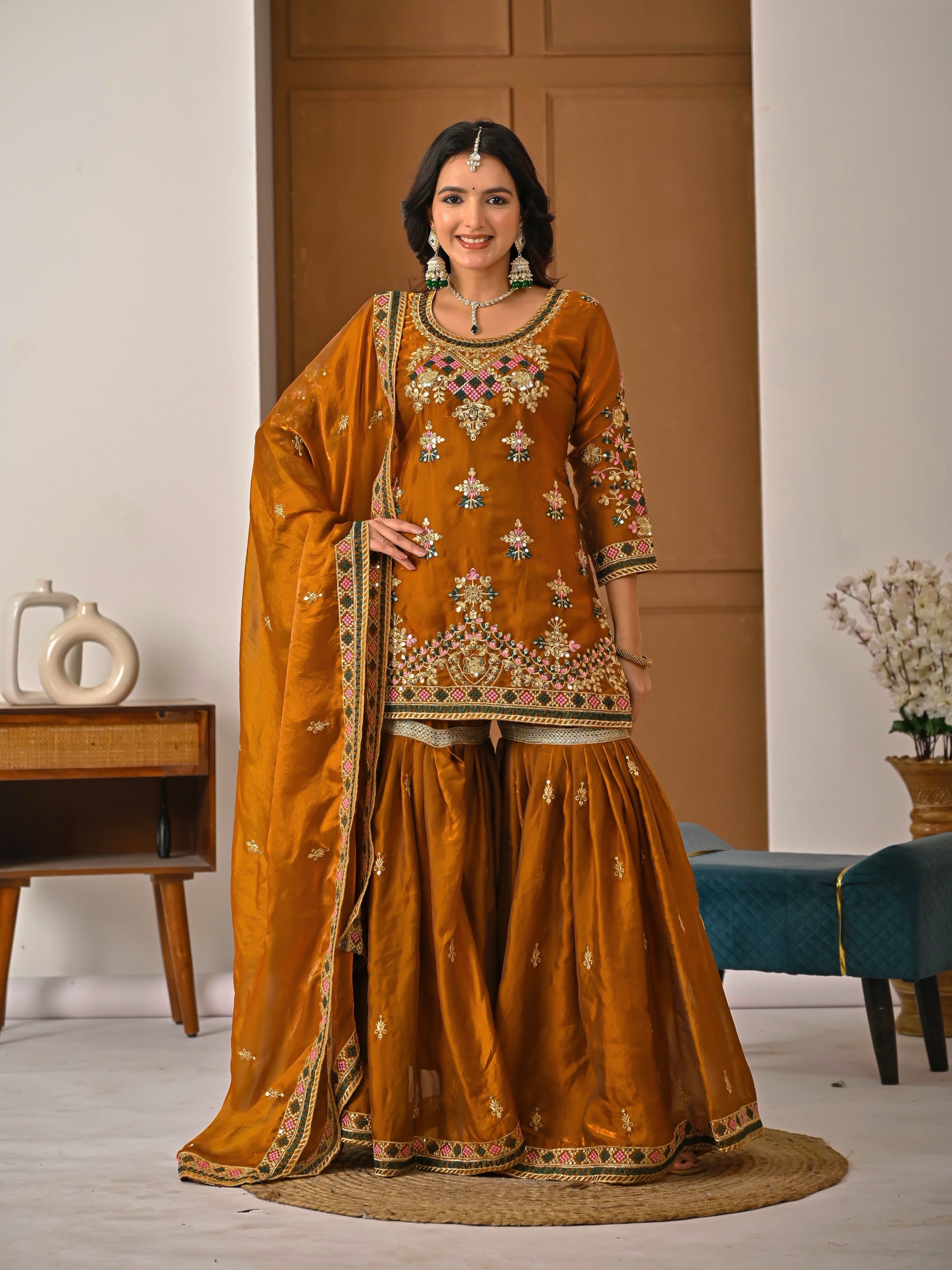 Mustard Brown Heavy Embroidered Kurti Sharara Set with Dupatta