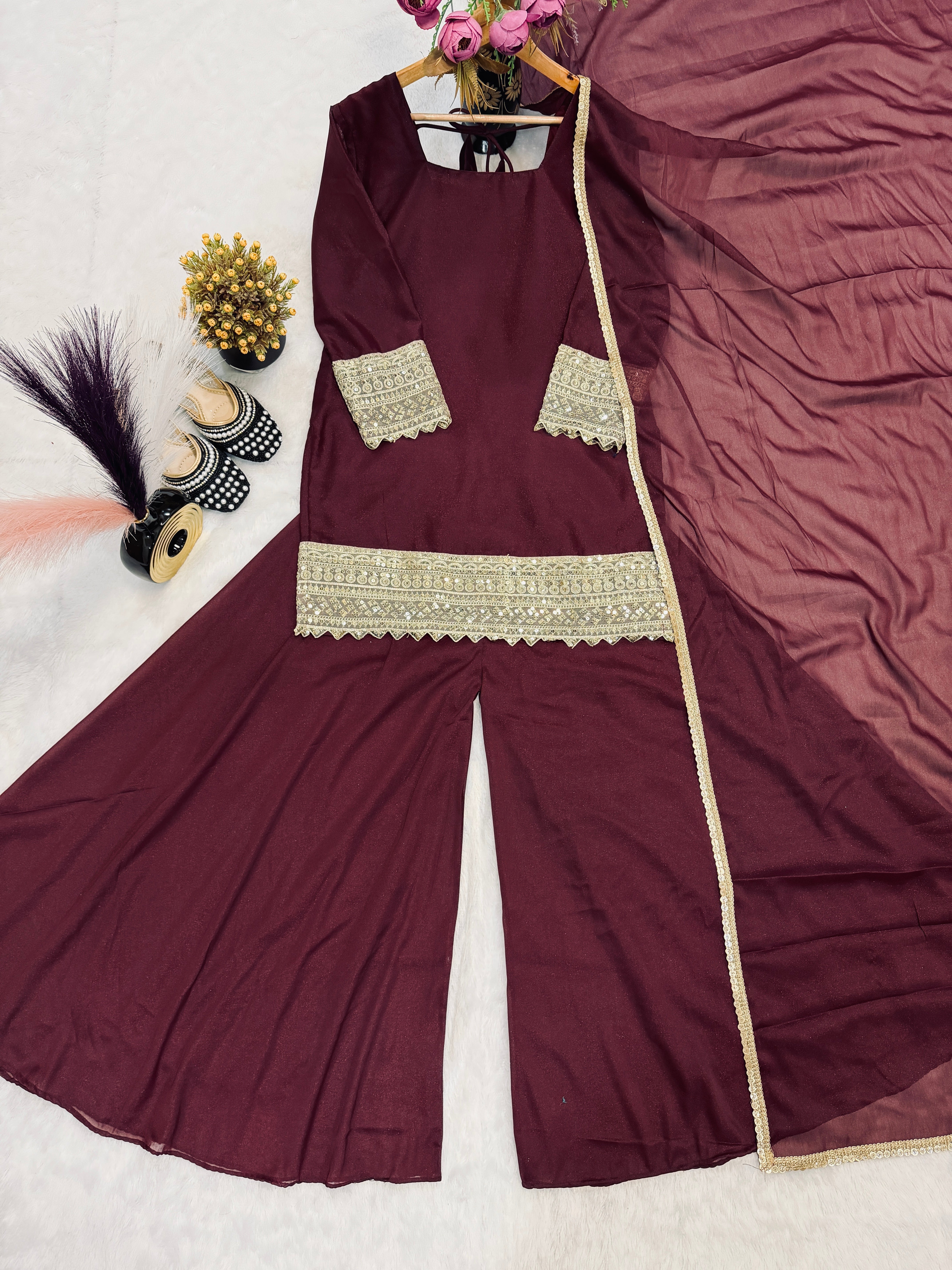 Royal Maroon Designer Kurti Palazzo Set with Dupatta
